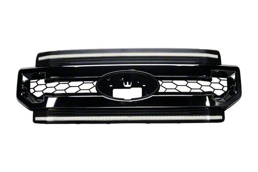 Sleek and Functional Grille Upgrade. The OLM Essential Series Grille adds a stylish, modern touch to your 2020-2022 Ford F-350 Super Duty. With white light output from its 2 DRL light bars, this grille enhances visibility while maintaining a sleek, glossy black finish for a striking look.