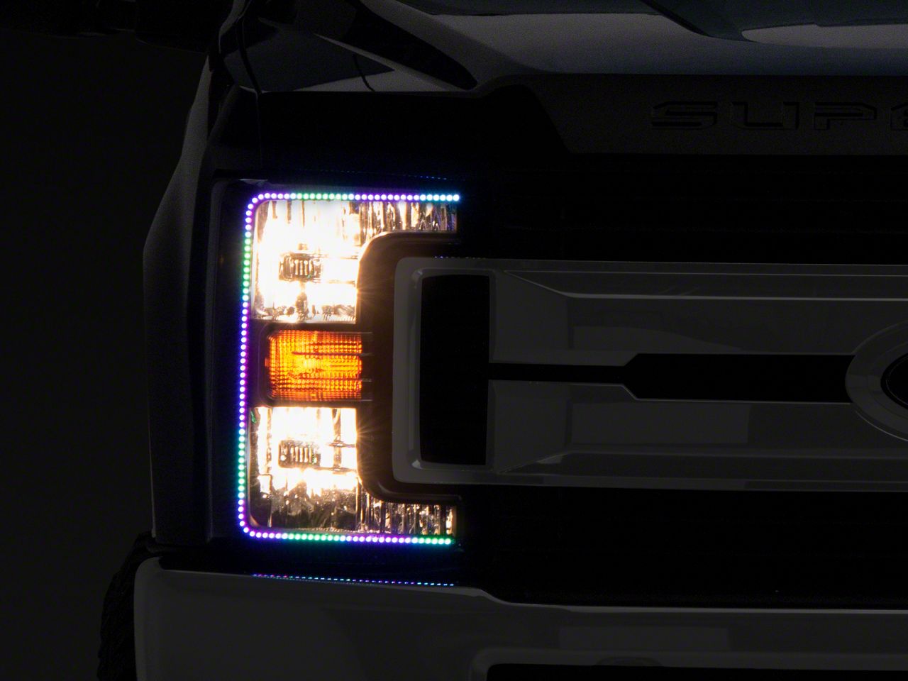 Application. These Oracle Black Edition Dynamic ColorSHIFT RGB+A OE Style Headlights; Black Housing; Clear Lens are engineered to fit 2017-2019 Ford F-350 Super Duty models with factory halogen headlights.