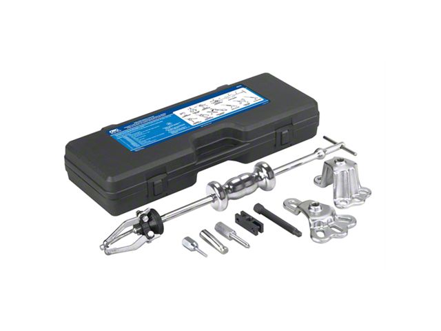 OTC's 4579 9-Way Chrome Plated Slide Hammer Puller Set pulls flange-type rear axles and most front-wheel drive hubs. Internal and external jaws provide a variety of combinations to pull bearings, gears, and seals. Two and three way cross blocks and cone provide the perfect jaw configuration for most jobs. Set also includes a grip wrench adapter and a dent puller attachment for sheet metal or other unique pulling requirements as well as a blow-molded case. The set is designed for use with other OTC 5/8"-18 thread slide hammer attachments.