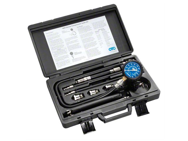 OTC's 5605 Deluxe Compression Tester Kit offers a complete package for compression testing on gasoline engines and comes complete with standard and specialty adapters. In addition to more common adapters, this versatile kit includes the deep well connector used on recessed plug well style heads and the Ford Triton engine adapter using 16 mm thread plugs. All metal components feature a corrosion resistant nickel plated finish. Adapters work on both flat and tapered seat plugs. Extra long 25" flex hose gauge assembly with quick coupler allows easy viewing out of cluttered engine compartments. 2-1/2" gauge features chrome bezel and rugged protective outer boot. Dual scale gauge reads 0-300 psi and 0-2100 kPa. Adapters: 8" deep well 14mm connector, 5" flex Ford Triton 16mm adapter, 12" flex-14mm standard reach, 12" flex-14mm long reach, and 10mm, 12mm, and 18mm thread adapters. Rugged blow-molded hard case with removable lid keeps kit components contained and organized when not in use. Includes repair parts kit. Value is at the core of the OTC tool and equipment portfolio. For a simple repair or the most complex drivability concern, these award-winning tools universally solve problems faster, and at better value, than any other product line available. Whether it�s a specialty tool or unique piece of service equipment, OTC provides top solutions to modern automotive service challenges while increasing technician productivity and shop profits.