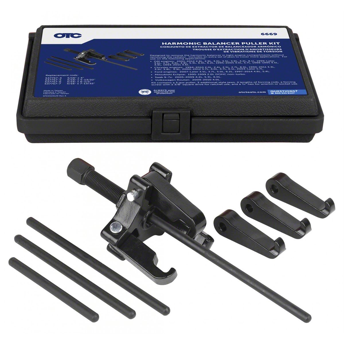 Designed for removing the harmonic balancer in tight engine compartments without removing the radiator. This kit includes an extra set of jaws to cover more applications and vehicles. Kit also contains the 3-jaw puller, four lengths of forcing rods, and a forcing screw with a 3/8" internal square drive for ratchet use, and a 3/4" external hex for wrench or socket use.