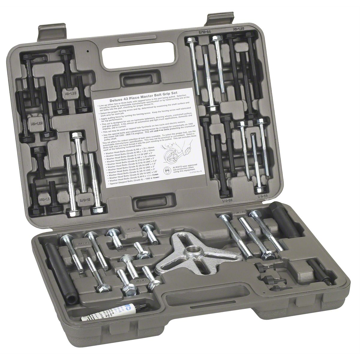 Multi-Purpose applications such as steering wheels, flywheels, harmonic balancers, pulleys and gears with tapped holes. • Includes special stepped bolts for 1990 and newer GM 3300-3800 V6 crankshaft pulleys.Contents of set:• 4-way slotted puller yoke and 2 lengths of hardened 'live-center in.; forcing screws - a set of 3 interchangeable forcing screw tips is included to optimize pressure and prevent 'walking in.;. • Blow molded case to prevent spilling and each bolt size is molded into the storage compartment.• Three each of the following bolt sizes:M8 x 1.25 x 90mm M8 x 1.25 x 45mm1/4-28 UNF x 3 in.; M8 x 1.25 x 65mm5/16-24 UNF x 3 in.; 5/16-18 UNC x 3.5 in.;3/8-24 UNF x 1.5 in.;3/8-16 UNC x 2 in.;3/8-16 UNC x 3 in.;3/8-16 UNC x 4.5 in.;M10 x 1.5 x 35mmSpecial Stepped Bolts – 1990 & Newer