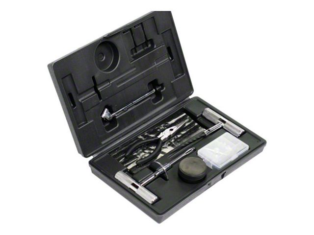 Kit Includes. This Overland Vehicle Systems Tire Repair Kit includes (20) Extra Long Vulcanized Plugs, 6.75-inch Reamer, 6.75-inch Probe With Hand Guard, Heavy Duty Extended Needle Nose Pliers, 8.75 Full Extended Air Gauge, Automotive Grade Lubricant, Pencil Style Dual Valve Repair Kit Storage Box which has (4) Chrome Caps, (4) Plastic Caps, (4) Valve Cores, (4) Tire Deflators and (1) Four-Way Valve Tool, (2) Allen keys and fits nicely in a high Impact Storage Case.