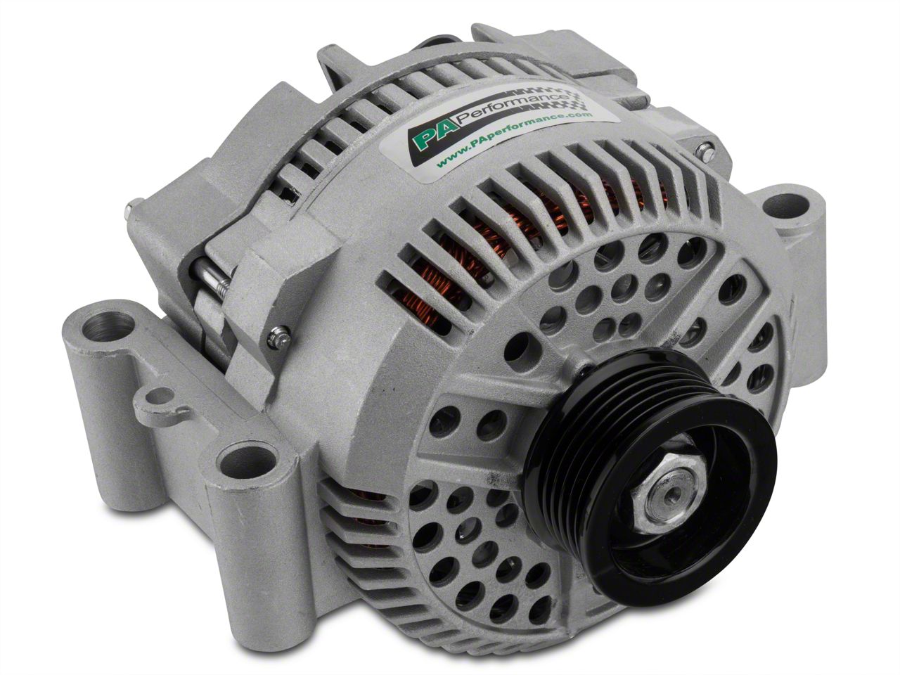 Durable Construction. This PA Performance Alternator is 100% new and come complete with internal voltage regulator and pulley that uses the factory belt and has a standard aluminum finish. All PA Performance Alternators are tested at the time of assembly to ensure reliability. Note: It is highly recommended that due to the increased output of this performance alternator that the main power wire be upgraded to handle the higher amperage output.
