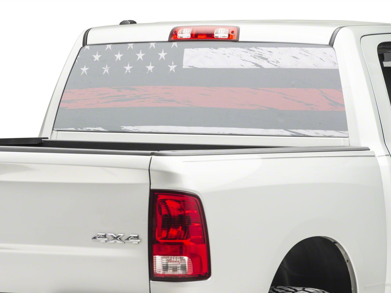 Customized Look. This Perforated Distressed Flag Rear Window Decal with Red Line is the perfect way to give your 1994-2026 RAM 1500 the patriotic styling it's been lacking. Also notable is the red line that serves as one of the flag’s stripes to show support for all of America's Fire Fighters.