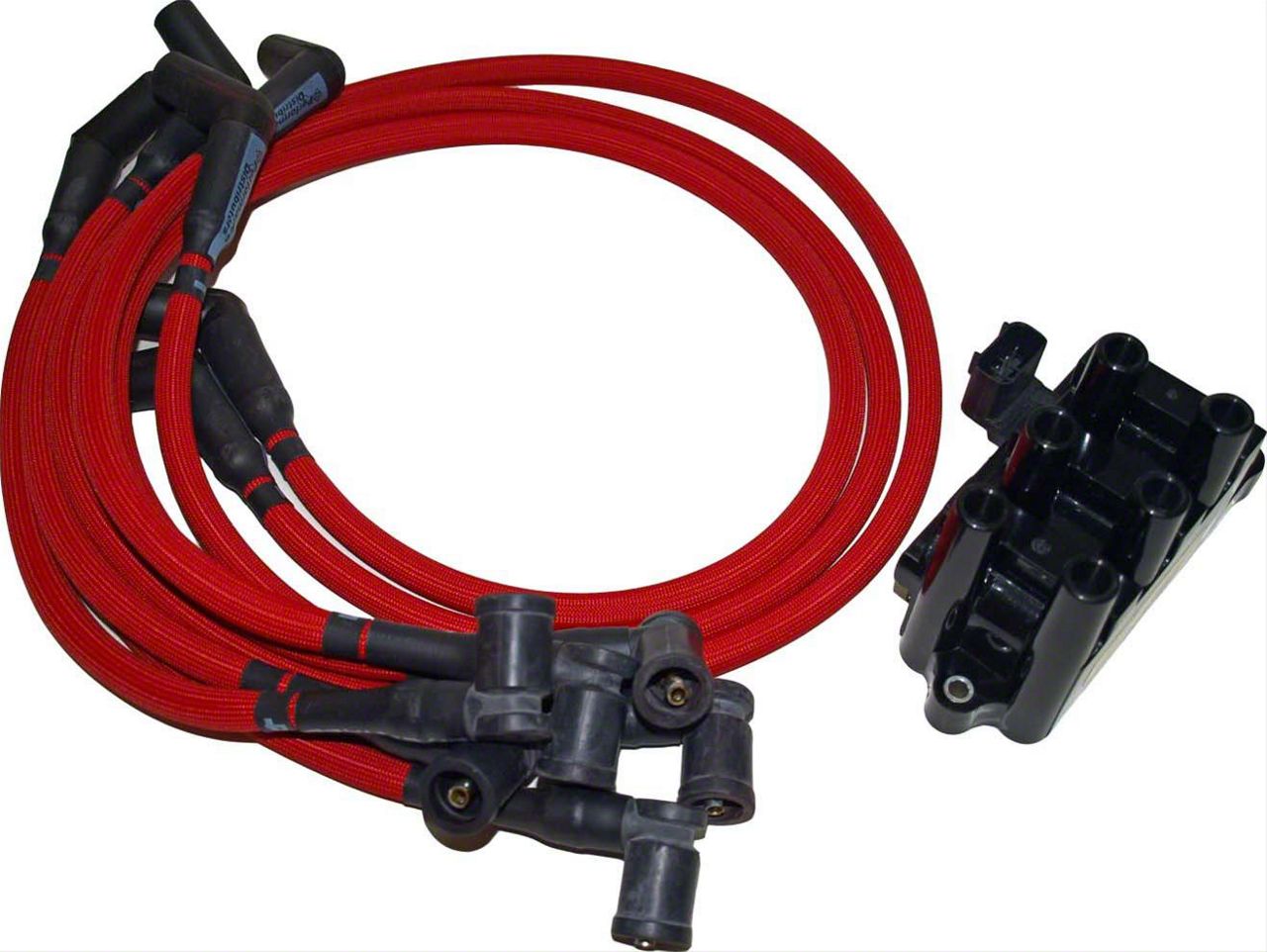 Construction and Appearance. This ignition kit features a 5.0 Dyna-Module with high dwell for maximum coil saturation and a powerful 45,000-volt Screaming Demon coil for optimal combustion. Brass terminals ensure superior spark delivery, while heat-treated fiberglass sleeves resist temperatures up to 1400°F. The entire kit comes finished in a bold red color for a custom under-hood appearance.