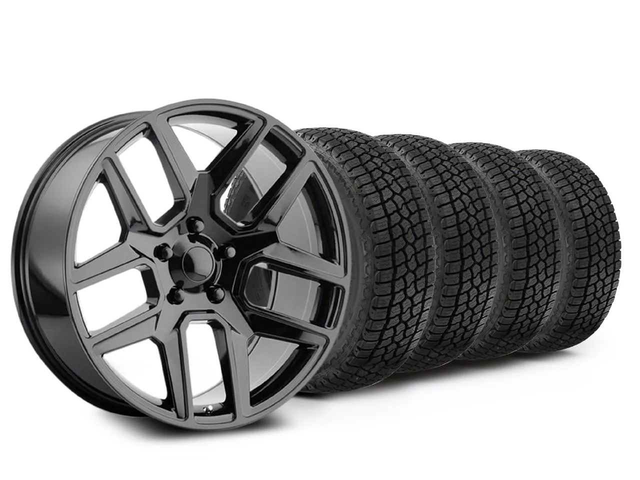 Mounted and Balanced Wheel and Tire Kit. This wheel and tire combo kit features (4) 20x9 Performance Replicas Night Edition Style Gloss Black 6-Lug Wheels and (4) Milestar All-Terrain Patagonia AT/R 275/60R20 tires that have been put together into an easy to buy kit that arrives to your door already mounted and balanced ready to be installed on your vehicle.