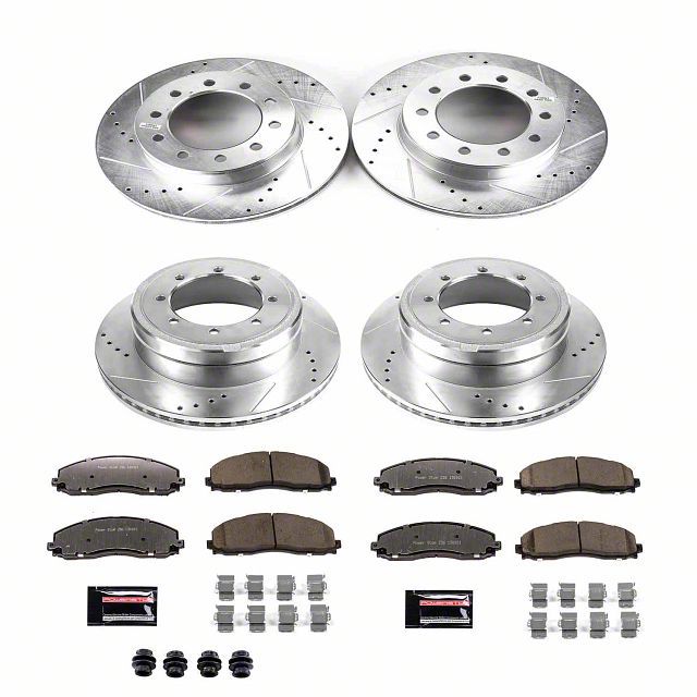 Severe Duty Braking. Made for the 4WD Ford F-350 Super Duty DRW models with wide track front suspension, this PowerStop Z36 Extreme Truck and Tow Brake Rotor and Pad Kit comes as a front and rear kit with a polished chrome and light gray finish. Built for severe duty braking applications, this kit is perfect for trucking and towing use and uses drilled and slotted 8-lug brake rotors with carbon ceramic material brake pads for strong and reliable braking.