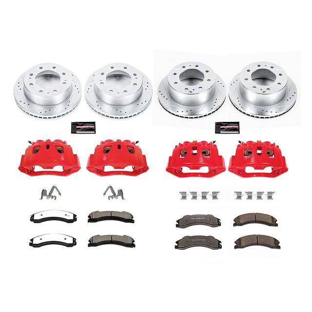 Red Powder Coating. The kit also includes red powder-coated cast iron calipers, equipped with two pistons for enhanced braking efficiency. Engineered with precision, this kit ensures a straightforward, drill-less installation, making it a practical choice for truck owners. Experience a significant upgrade in your vehicle's braking performance with the PowerStop Z36 Extreme Truck and Tow 8-Lug Brake Rotor, Pad, and Caliper Kit.