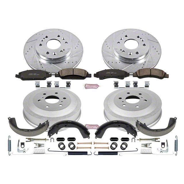 Comes Complete With Everything You Need. This product comes complete with (2) front rotors, (2) rear drums, (4) front brake pads, and (4) rear brake pads. In addition, it includes a ceramic brake lubricant, as well as all of its necessary installation hardware.