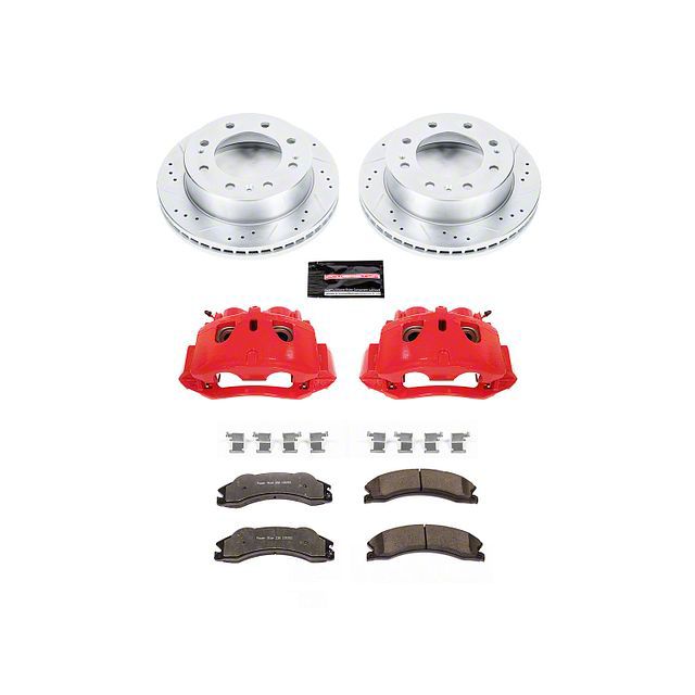 Red Powder Coating. The kit also includes red Powder-coated cast iron calipers, equipped with two pistons for enhanced braking efficiency. Engineered with precision, this kit ensures a straightforward, drill-less installation, making it a practical choice for truck owners. Experience a significant upgrade in your vehicle's braking performance with the PowerStop Z36 Extreme Truck and Tow 8-Lug Brake Rotor, Pad, and Caliper Kit.