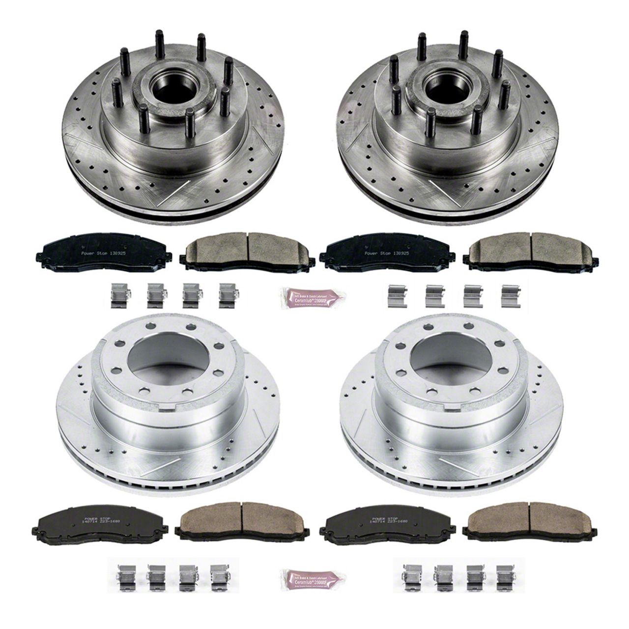 Complete Front and Rear Rotor and Pad Kit. This front and rear PowerStop Z23 Evolution Sport Brake Rotor & Pad Kit comes with the following parts: (2) front brake rotors, (2) rear brake rotors, (4) Z23 series front brake pads, and (4) Z23 series rear brake pads. The package also includes stainless steel hardware, a pin bushing kit, and high-temperature lubricant.