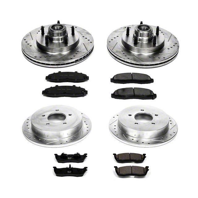 Complete Kit. This PowerStop brake kit includes (2) cross-drilled and slotted rotors front rotors, (2) cross-drilled and slotted rotors rear rotors, (2) pairs of ceramic front brake pads, (2) pairs of ceramic rear brake pads.