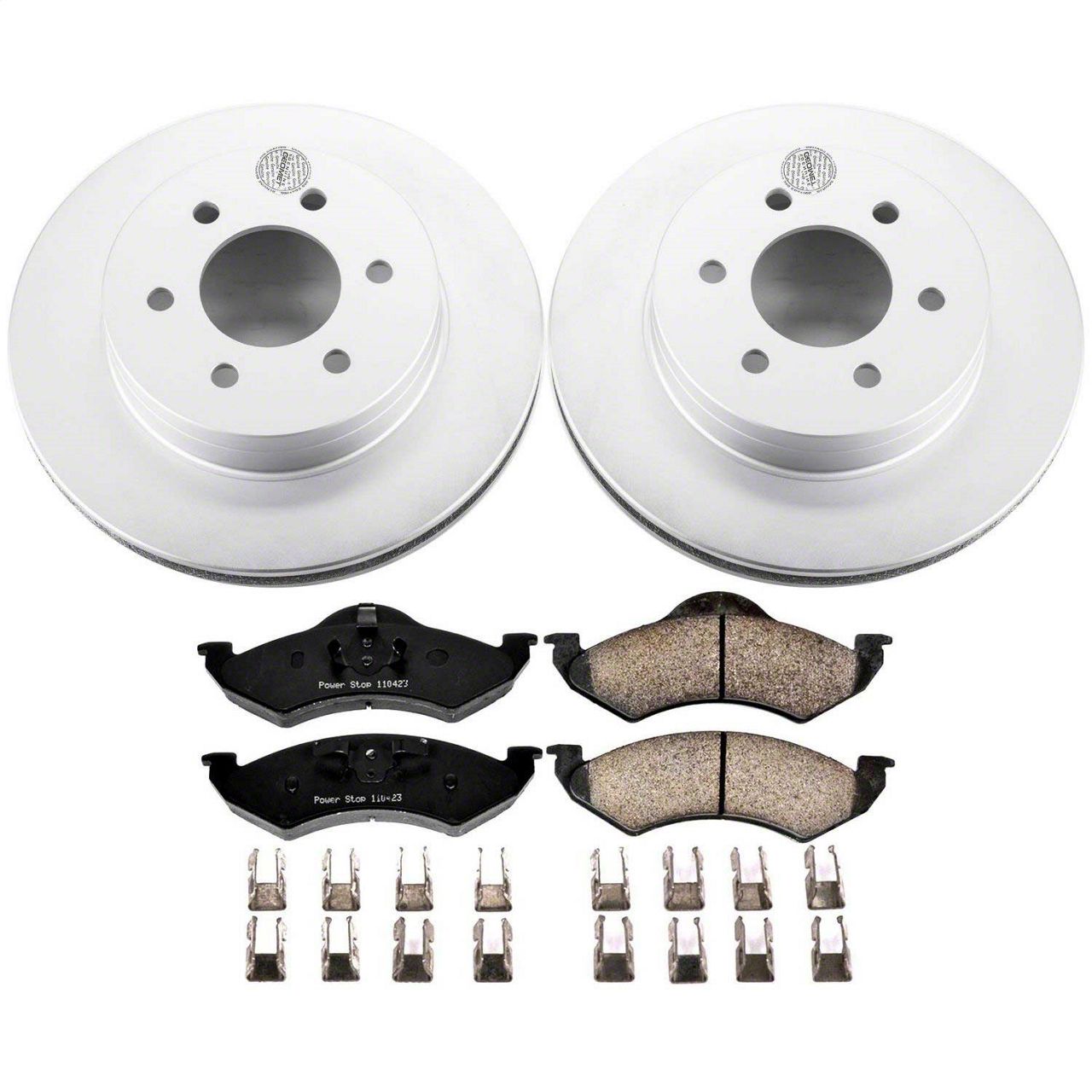 PowerStop is on a mission to deliver an easy way for any driver to upgrade their brakes - no matter where or how they use their vehicle. Our Z17 Evolution Geomet Coated Rotor Brake Kit includes brake pads, rotors, and stainless-steel hardware; everything you need for the affordable, easy replacement brake kit for your daily-driven vehicle. The Z17 Evolution pads feature a low-dust formula, validated through on-vehicle 3rd party tests in the USA, to keep your wheels looking like new. These pads also have multi-layer rubberized shims that insulate noise for virtually silent braking. The rotors are treated with a thin layer of Genuine GEOMET 360 coating to protect against rust and corrosion without diminishing braking performance, and are manufactured to original equipment specifications. If you're looking to refresh the look and braking performance of your old, worn-out brakes, look no further. Say hello to a smooth, quiet commute with the Z17 Evolution Geomet Coated Rotor Brake Kit.
