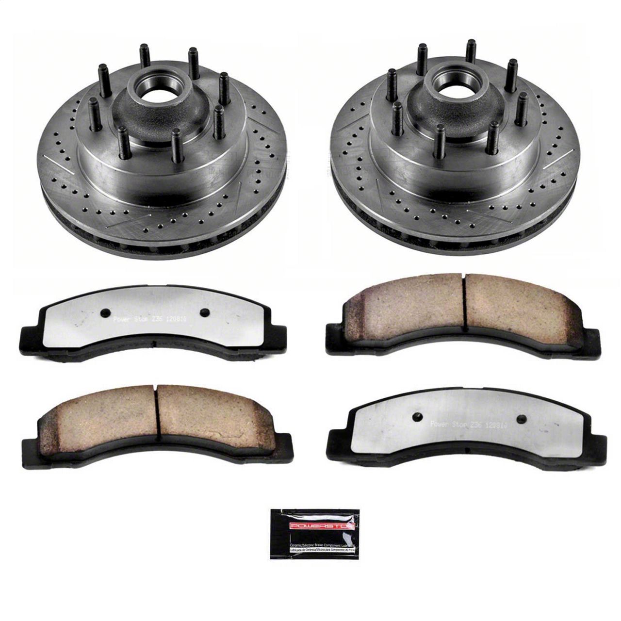 Cool Control. The PowerStop Z36 Extreme Truck and Tow 8-Lug Brake Rotor and Pad Kit; Front (1999-2002 2WD F-350 Super Duty SRW with Rear Wheel ABS) features precision-drilled holes and machined slots that enhance cooling and reduce brake fade. This advanced design improves rotor ventilation, ensuring consistent braking performance even during demanding driving conditions.
