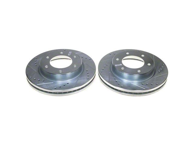 Description. PowerStop drilled and slotted rotors provide a bolt-on upgrade for improved brake cooling and performance. Precision cross-drilled for maximum cooling and maximum performance during extreme conditions. The rounded slots sweep away gas, debris, and moisture to keep a clean friction contact patch on the rotor surface providing smooth, safe braking. Silver zinc dichromate plating resists rust and corrosion. With a direct OE fit, there are no special modifications needed. Upgrading the looks and stopping power of your vehicle has never been easier.