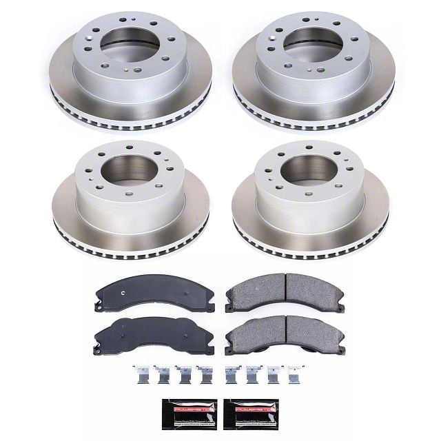 High-Duty Stopping Power. This PowerStop Semi-Coated 8-Lug Brake Rotor and Pad Kit; Front and Rear combines precision cross-drilled and slotted rotors with carbon-infused ceramic pads to deliver fade-resistant braking under heavy loads. The rotor slots and drilling channels heat and brake dust away from the pad contact surface, maintaining consistent friction even during repeated stops.