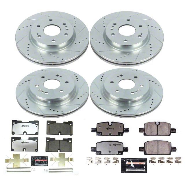 High-Strength Components. The kit features drilled, slotted, and zinc-plated 6-lug cast iron rotors, ensuring superior heat dissipation and increased durability. Equipped with proprietary carbon-fiber ceramic Z36 brake pads, this kit guarantees excellent stopping power and fade-free performance. The advanced composition of these pads ensures minimal noise and dust, and the inclusion of stainless-steel shims further enhances the kit's performance.
