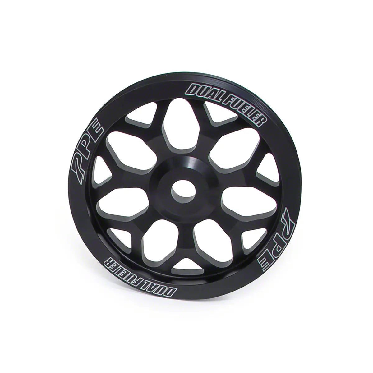 Made from machined billet aluminum and then anodized for strength and style. The new PPE Dual Fueler Pulley Wheel features a more robust design with machined spokes to dress up your engine bay.