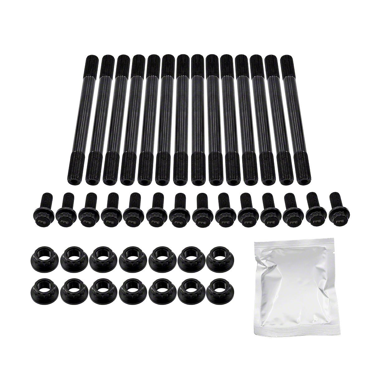 Installation. Designed for adaptable installation as a direct replacement, the PPE Main Stud and Girdle Bolt Kit integrates seamlessly with your engine assembly. The included lubricant packet ensures precise torque application during setup, which is crucial for optimal clamping force. Professional installation is recommended due to the precision required, making this a reliable choice for performance engine builds or restorations.