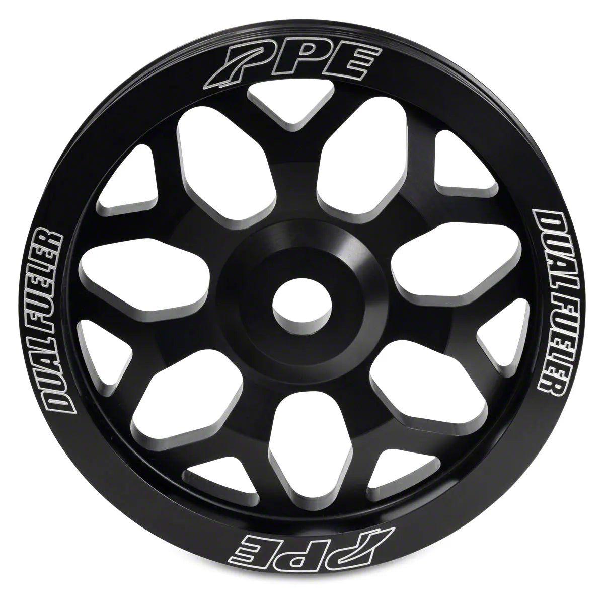 Made from machined billet aluminum and then anodized for strength and style. The new PPE Dual Fueler Pulley Wheel features a more robust design with machined spokes to dress up your engine bay.