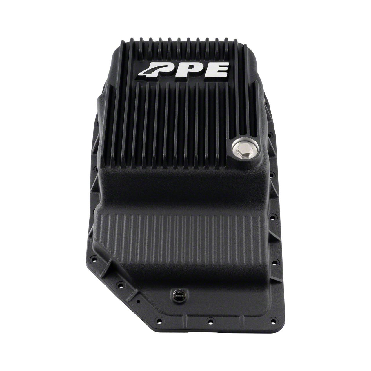Construction and Appearance. Crafted from high-grade A356.0-T6 heat-treated cast aluminum alloy, the PPE transmission pan combines structural integrity with superior heat management. Its black color provides a sleek look. External fins promote passive cooling by channeling underbody air, while internal heat sinks help dissipate heat and reduce fluid turbulence.