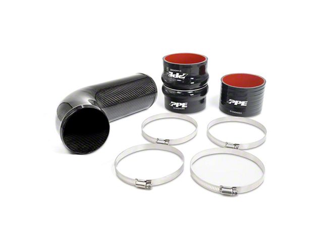 The PPE Zilla Carbon Fiber Turbo Inlet Tube replaces the restrictive, plastic intake tube and resonator that comes stock on your truck. The kit includes the PPE Zilla Carbon Fiber Turbo Inlet Tube, two Heavy-Duty 6mm 5ply Black Silicone Couplers, and stainless steel coupler clamps.