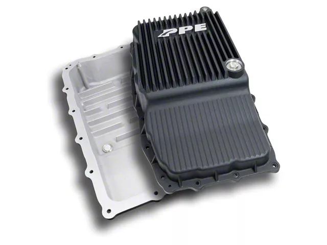 Improved Cooling. The PPE Heavy-Duty Cast Aluminum Transmission Pan; Black offers a cost-effective way to enhance your transmission's performance and durability. The exclusive removable and replaceable fluid filter makes servicing a breeze, eliminating the need for frequent pan replacements, and it can hold an extra quart of fluid for improved cooling. This upgrade not only ensures smoother operation but also safeguards your transmission, ultimately reducing service costs and increasing its service life.