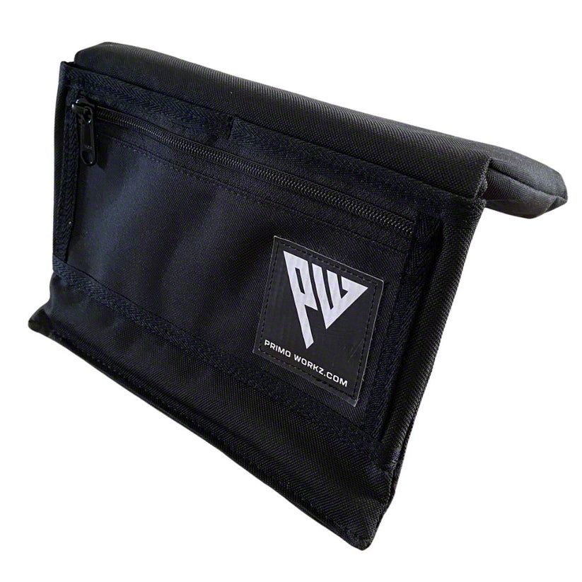 Construction and Appearance. Constructed with a stainless steel plate frame and covered in durable 600D black canvas, the Primo Workz Armrest is designed to withstand daily use. It also features industrial-grade #5 YKK zippers and sliders for added durability and functionality.