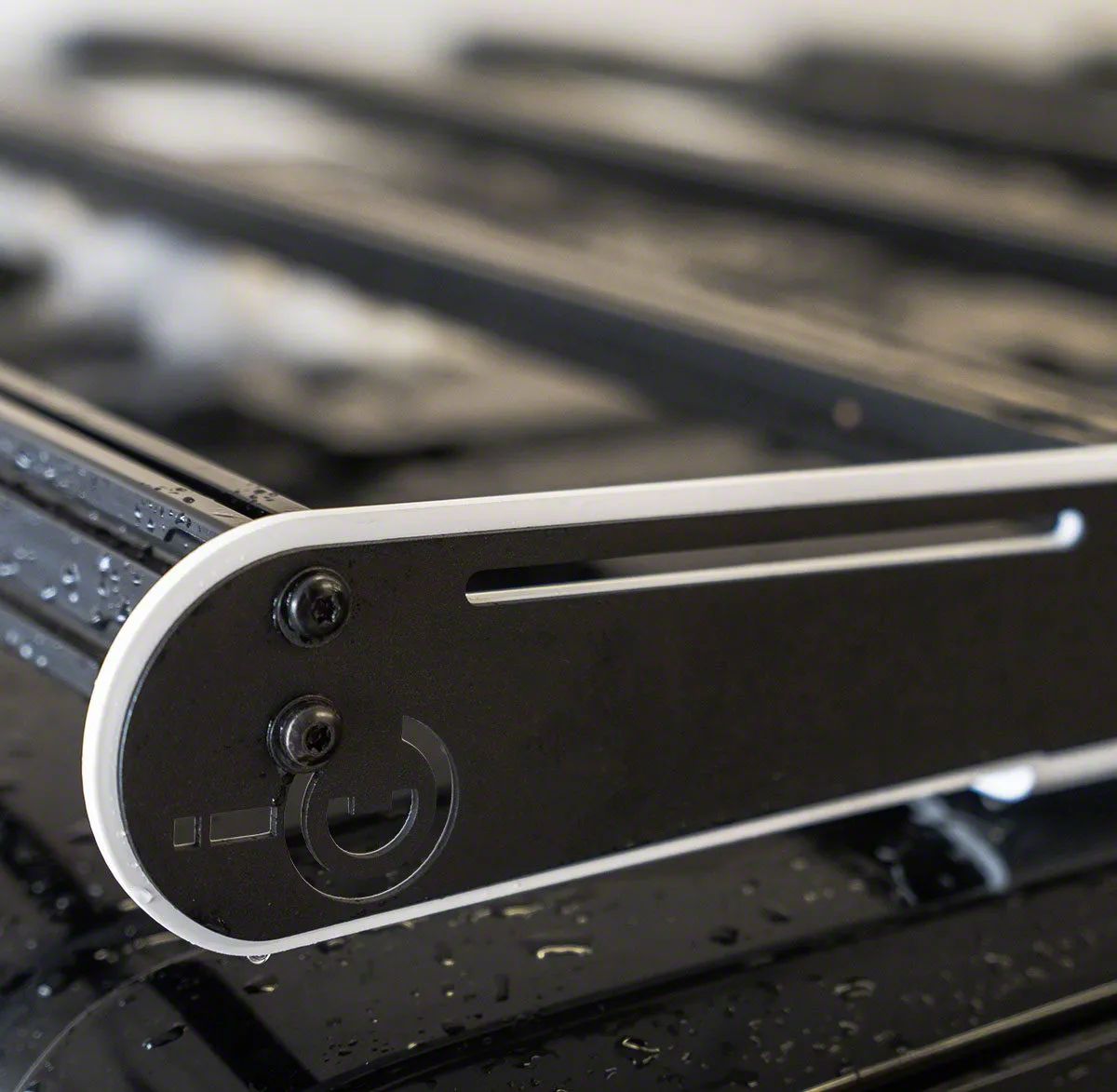 Construction and Appearance. Constructed from laser-cut 3/16-inch bare 5052 aluminum, this roof rack is both lightweight and sturdy, ensuring a corrosion-resistant lifespan thanks to its black powder-coated finish. The noise-reducing edge trim minimizes wind noise, making for a quieter ride, while the integrated light bar cutout adds a functional flair that doesn't compromise the vehicle's aerodynamics.