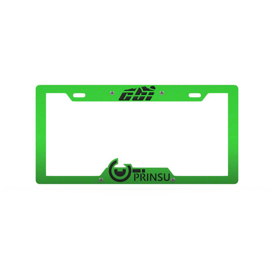 Description. Tired of bent license plates – or using those cheap, plastic license plate covers? We’ve got you covered. CBI and Prinsu have designed a heavy-duty, steel license plate frame to protect your license plates on the trail and on the road. This rugged plate cover will universally fit all USA license plates and easily installs to any vehicle’s factory mounting bracket with standard hardware. Each piece utilizes stainless steel rivets for superior strength, with powder coating available in eight different color combinations for extra durability and style. This is a great addition to any vehicle and a great way to show your love for CBI and Prinsu!