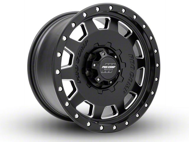 This 18x9 Pro Comp Wheels Hammer Satin Black Milled 6-Lug Wheel is completed in a high-quality satin black finish with steel milled accents that will be the envy of everyone. There's a durable clear coat that protects against driving hazards.