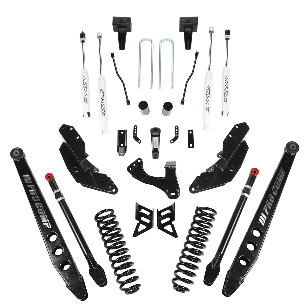Super-Strong Control Arm Brackets. To ensure the control arms are configured correctly, the Pro Comp Suspension Stage III 4-Link Suspension Lift Kit comes with 4-link control arm brackets. These super-strong control arm brackets are precision-fabricated and welded for superior rigidity. To protect these 4-link brackets from rust, these are given a durable, black, powder-coat finish.