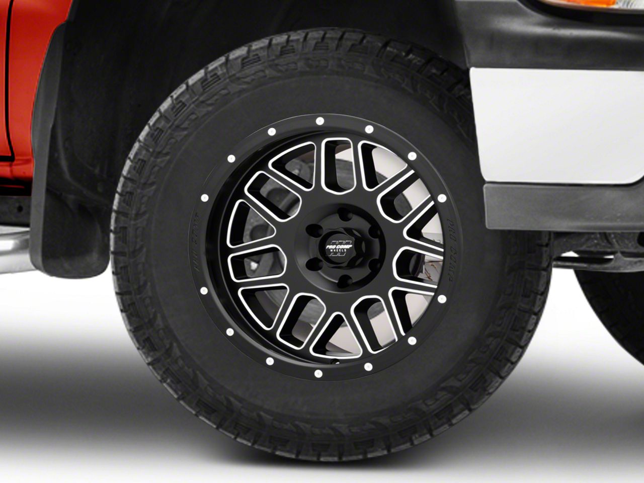 The 18x9 Pro Comp Wheels Vertigo Satin Black Milled 6-Lug Wheel; 18x9; 0mm Offset is completed in a high quality, satin black finish. The milled steel accents are where it really shines through. The accents make the split section of the spokes pop along the faux beadlock.