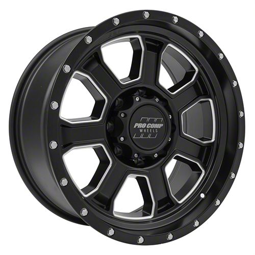 The 20x9 Pro Comp Wheels Sledge Satin Black Milled 8-Lug Wheel; 20x9; 0mm Offset is completed in a high quality, satin black finish. The milled steel accents are where it really shines through. The accents make the split section of the spokes pop along the faux beadlock.