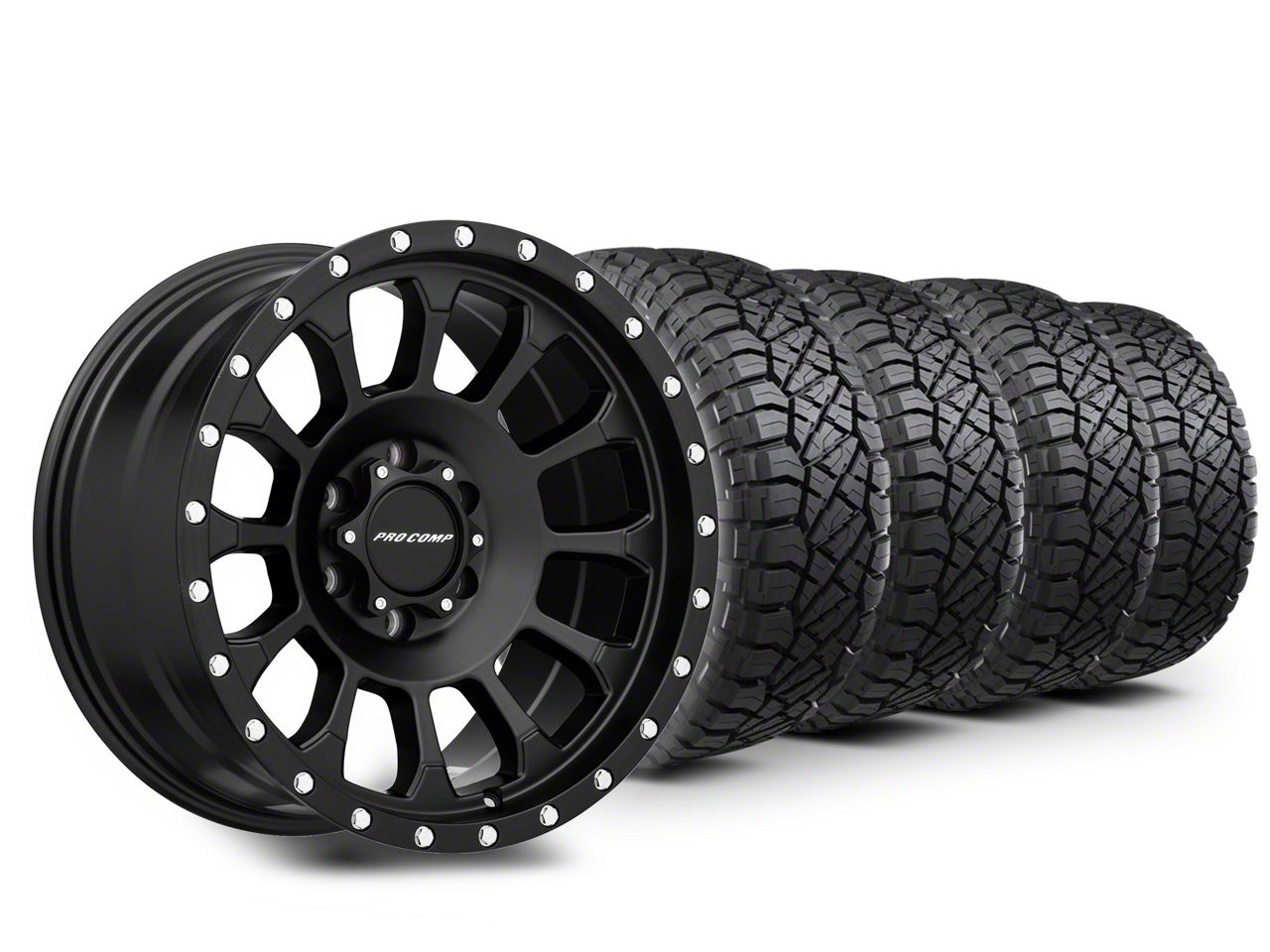 Mounted and Balanced Wheel and Tire Kit. This wheel and tire combo kit features (4) 18x9 Pro Comp Rockwell Satin Black 6-Lug Wheels and (4) NITTO Ridge Grappler All-Terrain 275/70R18 tires that have been put together into an easy to buy kit that arrives to your door already mounted and balanced ready to be installed on your vehicle.
