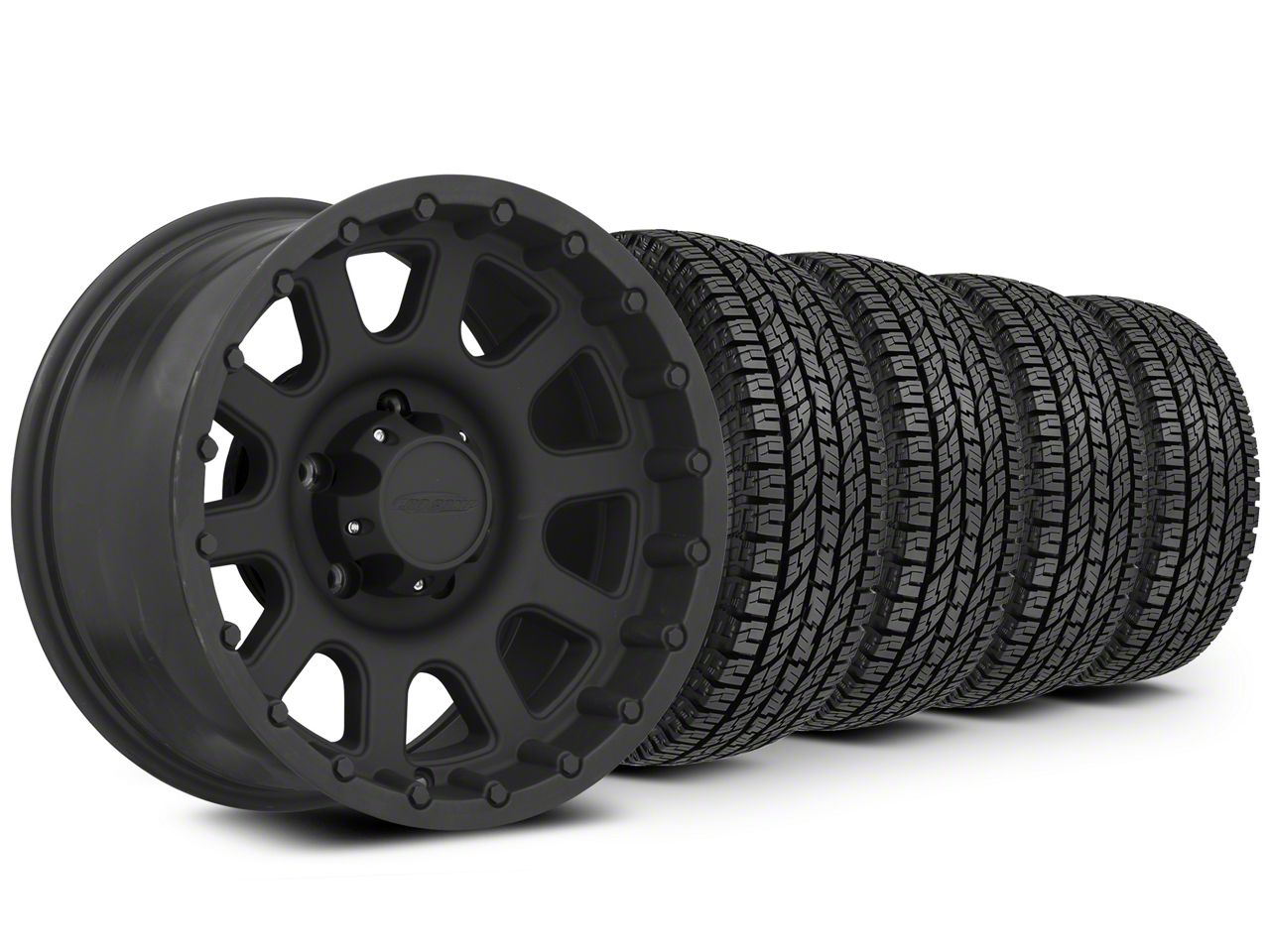 Mounted and Balanced Wheel and Tire Kit. This wheel and tire combo kit features (4) 17x9 32 Series Bandido Flat Black 5-Lug Wheels and (4) Yokohama All-Terrain Geolandar A/T 285/70R17 tires that have been put together into an easy to buy kit that arrives to your door already mounted and balanced ready to be installed on your vehicle.