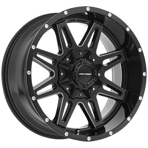 The 20x9.5 Pro Comp Wheels Blockade Gloss Black Milled 8-Lug Wheel; 20x9.5; -6mm Offset is completed in a high quality, gloss black finish. The milled steel accents are where it really shines through. The accents make the split section of the spokes pop along the faux beadlock.
