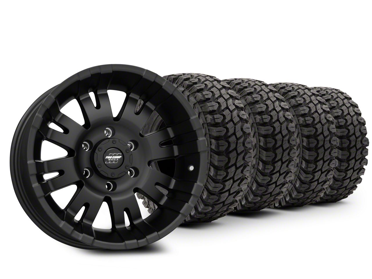 Mounted and Balanced Wheel and Tire Kit. This wheel and tire combo kit features (4) 18x9.5 Pro Comp Wheels 01 Series Satin Black 6-Lug Wheels and (4) Gladiator Mud-Terrain X-Comp M/T 33x12.50R18 tires that have been put together into an easy to buy kit that arrives to your door already mounted and balanced ready to be installed on your vehicle.