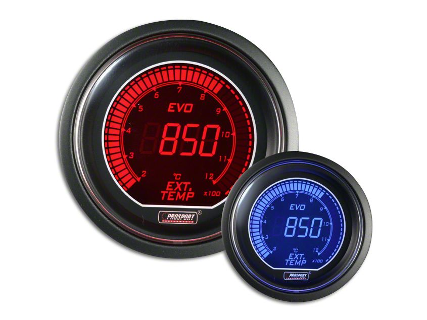 EVO Series Performance. This EVO Series Prosport Dual Color Evo Exhaust Gas Temperature Gauge allows you to easily monitor the temperature of vehicle exhaust gas with its industry-first dual-color display. This gauge comes with a black bezel and case. You can choose which color to run during the day and choose the other for night driving.