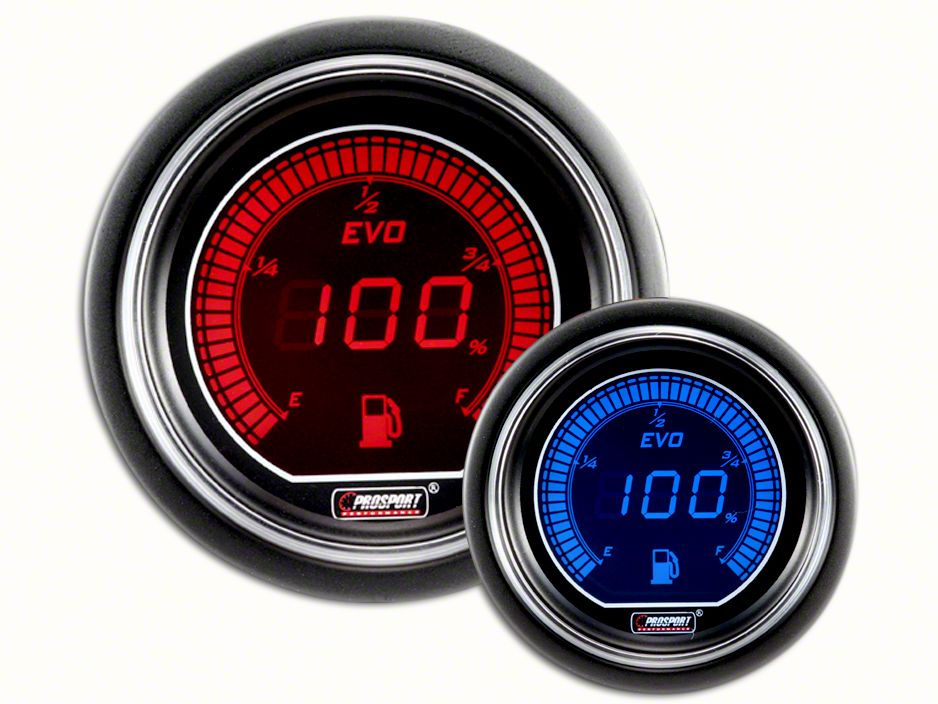 High Quality Compact Design. The Prosport Dual Color Red/Blue Evo Electrical Fuel Level Gauge integrates easily into your dash thanks to its compact architecture. Accurate fuel level readings are displayed on a 52mm screen using a 270 degree digital sweep, with clearly marked increments showing the E, 1/4, 1/2, 3/4 and F levels. The digital display is far clearer than stock, allowing you to stay focused on the road ahead.