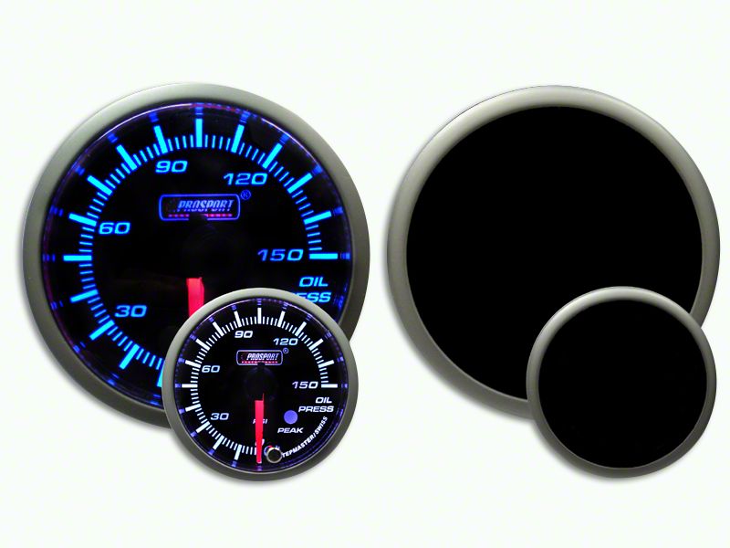 Quick, Accurate Pressure Readings. A small-sized accessory such as the gauge doesn’t get stylish emphasis as the grille, but Prosport Dual Color Premium 0-150 PSI Oil Pressure Gauge is here to rewrite the rules. This gauge features a blue and white color combo with a bright red pointer. The vivid colorfast blend provides quick readings along its precision calibrated face. It blacks out on shut down to give your dash a bold stylish appearance.