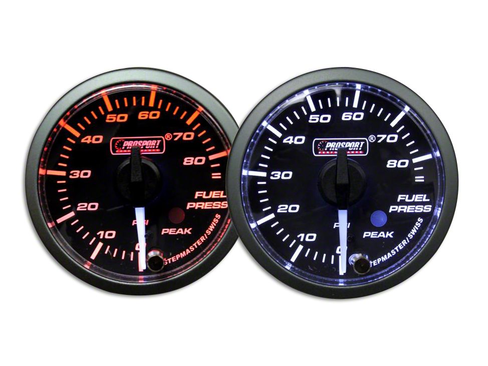 Ultimate Premium Gauge. This Prosport Premium White-Pointer Series gauge is calibrated to provide accuracy. Featuring a 270 °dial face pointer limit, you get a pressure-scale range of 0-85 psi, enabling you to have full control of your fuel-pump lift output pressure.