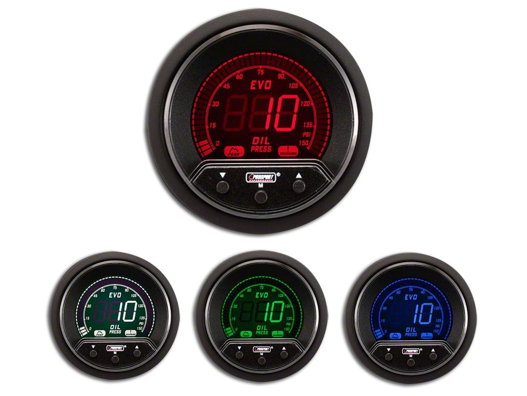 Premium Engine Monitoring. Protect your engine from oil pressure dips by installing the Prosport Premium EVO Oil Pressure Gauge. This premium gauge provides instant, accurate readings of your oil pressure (between 0-150 PSI) as you make various engine modifications. It activates a digital sweep when you start up your engine that calibrates the gauge to allow for consistent feedback. You can access peak oil pressure readings and also program warning settings that alert you when you hit low pressure.