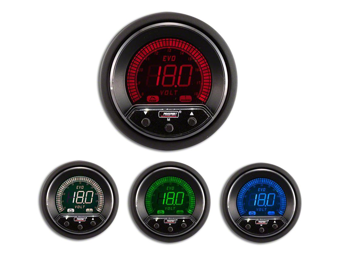 Beautiful Display. This Prosport Evo Volt Gauge features a gorgeous 4 color display. Like Other Premium Evo series gauges, you can select between white, red, blue, and green backlighting with the touch of a button. It also features a fully programmable audible and visual warning function that alerts you when voltage readouts are high.