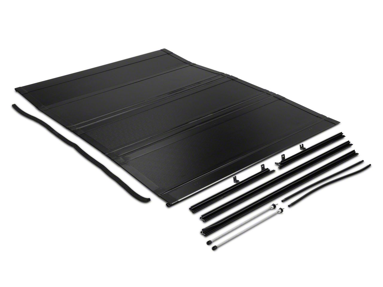 Quality Construction. Proven Ground manufactures their Low Profile Quad Fold Tonneau Cover with a frame that is extruded from aircraft grade aluminum for superior strength. The lightweight, quad fold aluminum panels feature a matte black, weather resistant, grain textured finish that can withstand the test of time without fading, denting, or scratching, making sure your truck always looks good.