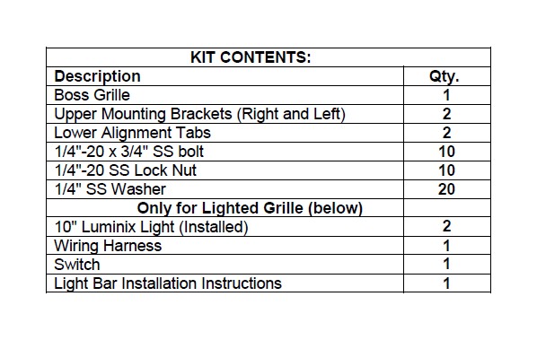 1. Remove Grille from packaging. Check to see if all parts from above table of kit contents are included.