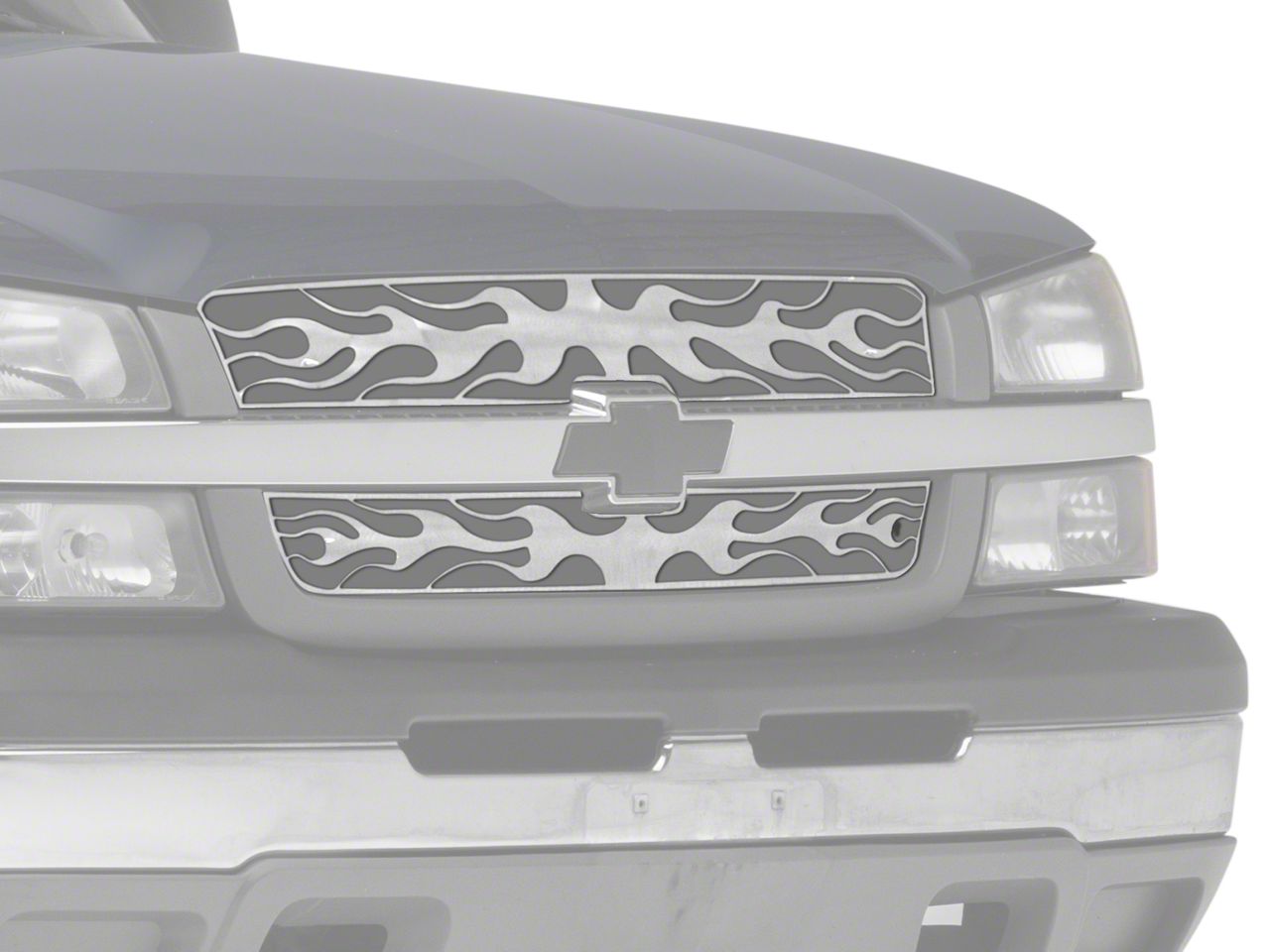 Application. This Polished Flaming Inferno Stainless Steel Upper Overlay Grille is made for 2003-2004 Chevrolet Silverado 3500 HD models.