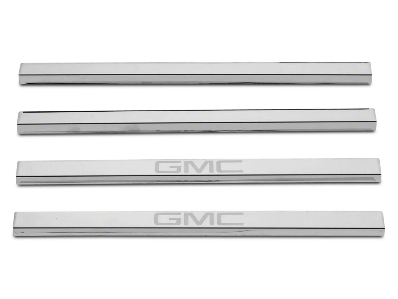 Application. As shown by the GM logo, these Stainless Steel Door Sills are especially made for GMC Sierra models, specifically those released between 2014 and 2018. Please be sure to choose your application from the options listed above.