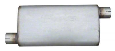 Construction and Appearance. This muffler is crafted from corrosion-resistant stainless steel, offering excellent durability under harsh driving conditions. It features a straight-through high-flow design and a 2.50-inch inlet and outlet for optimal exhaust movement. Finished in a natural, raw stainless look, it delivers a no-nonsense appearance that complements performance-driven builds.